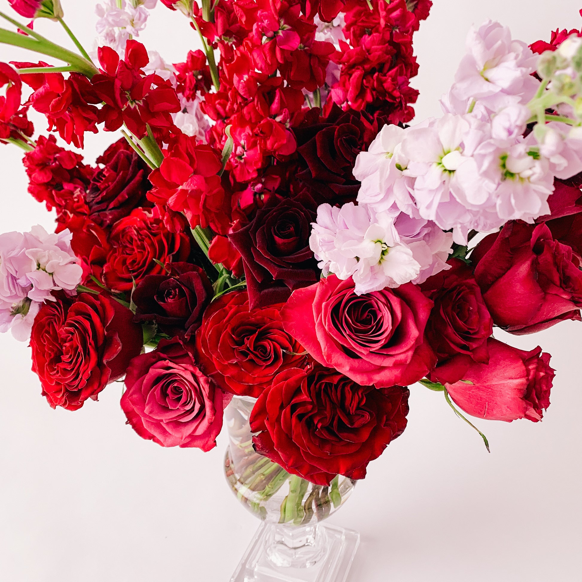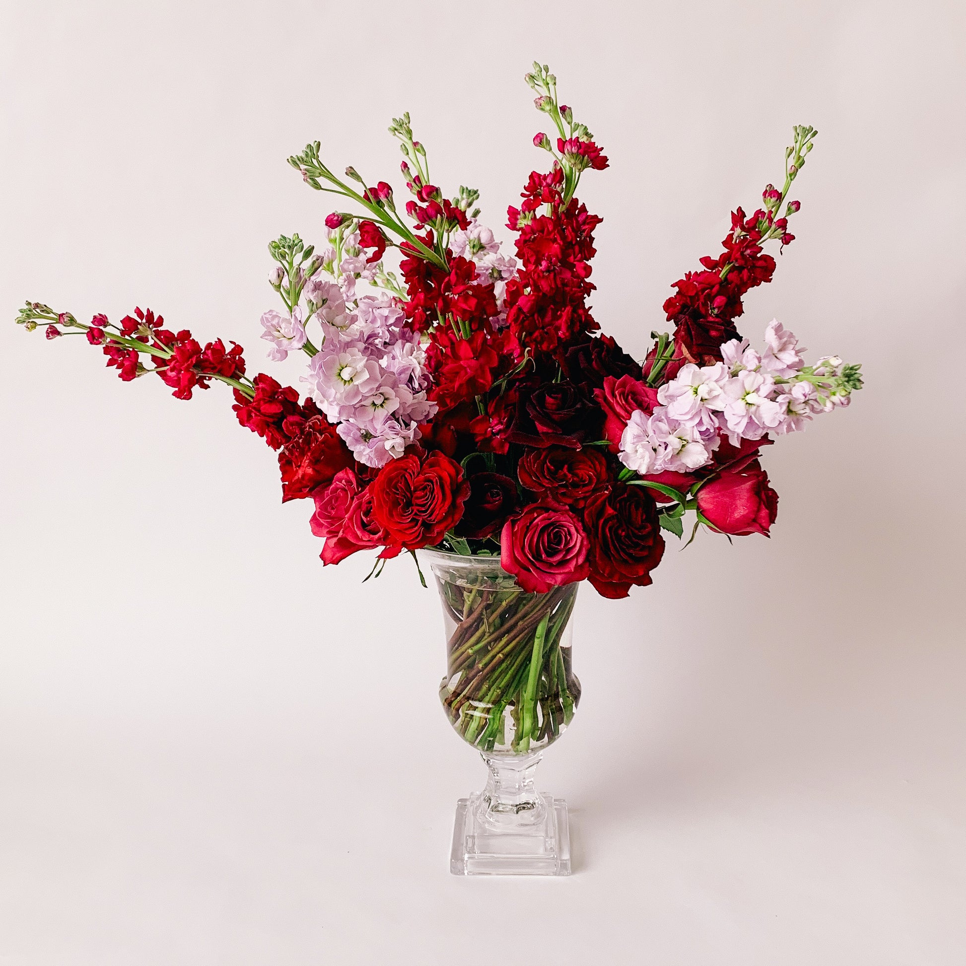 Celebrate love this Valentine's Day with a lush handcrafted floral arrangement from Lorraine's Cottage in Cleveland, OH. This grand glass urn arrangement is thoughtfully designed with 3 dozen fresh, romantic roses and 1 dozen whimsical stock flowers to capture the enchanting essence of a flower garden. Perfect for brightening a dining table or side table, our arrangements bring a touch of magic to any space.